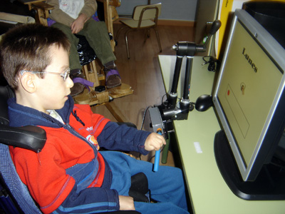 Por cierto que Daniel sigue aumentado su vocabulario hablado (el escuchado y entendido es completísimo), y el otro día le añadió “caballo”, supongo que muy motivado por las sesiones de hipoterapia, durante las cuales monta al pony “Manchas”. Estaba tan contento, tan contento de haber pronunciado una nueva palabra, que creo que dijo caballo unas cincuenta veces. En la fotografía se le ve frente al ordenador del colegio, que acciona mediante un pulsador de palanca, y al que le ha sacado mucho rendimiento este curso.