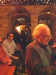Poetas de distintas generaciones: Fernando Aínsa (en primer término); al fondo, Miguel Angel Ortiz Albero, Jesús Jiménez y Nacho Tajahuerce.