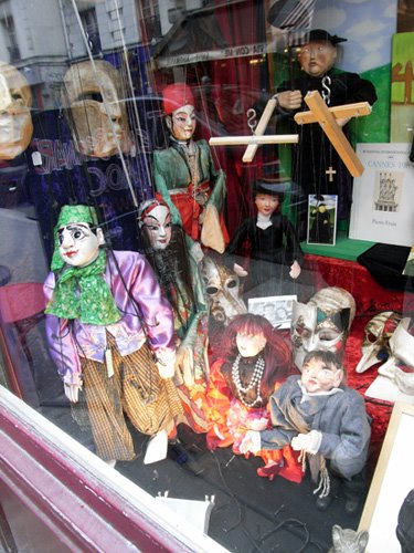 Bien, la librería Scaramouche, decíamos. Es lo que se definiría ahora como una librería con «valor añadido», un espacio no sólo destinado a la venta de libros. Un lugar para estar, detenerse, hablar. Hablar con el propietario -que ojea y lee distraído en apariencia por debajo de su melena gris rizada, mientras algunos curiosos vamos dando vueltas y ojeando a nuestra vez, hasta que entiende que ya hay demasiada gente por allí y entonces gira lentamente, se levanta y dice «Bon soir» y sonríe, y ya sabes que si preguntas él contestará-. A los buenos libreros les gusta hablar. Un lugar, Scaramouche, para intercambiar conocimiento y dudas o extrañezas con los demás clientes. Un lugar para confundirse un poco entre las marionetas y títeres, algunos de cumplida estatura. Scaramouche. Una forma de vida, al fin y al cabo.