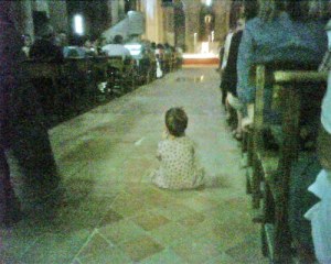 Esta pequeña, sentada en mitad del pasillo de la iglesia del Monasterio de Veruela, asistía ayer por la tarde, junto a otros muchos espectadores, a los actos finales del VIII Festival Internacional de Poesía Moncayo. Las piernas que asoman a la izquierda son las del poeta Gonzalo Escarpa, uno de los participantes este año en los actos del Festival (junto a otras muchas personas, cuyos nombres figuran en el programa del Festival y que por eso no cito aquí -sería muy largo). Esta edición ha estado dedicada a la figura de Miguel Hernández, que cumpliría 100 años el próximo 2010. Por eso, además de lecturas de las obras personales de los distintos poetas invitados, se leyeron un buen montón de poemas de Hernández, se cantaron sus versos, se habló de su vida, de su obra, de su muerte -tan triste, tan desoladora-. El periodista y escritor Miguel Mena, que presentó las actuaciones, hizo una elocuente reflexión: hablamos de Hernández (y de otros contemporáneos suyos añadiría yo) como si pertenecieran a otro mundo, y quizás así es, aunque no deja de ser paradójico que Miguel Hernández sería más jóven, si viviera, que Francisco Ayala, de quien no dudamos sea coetáeno nuestro.