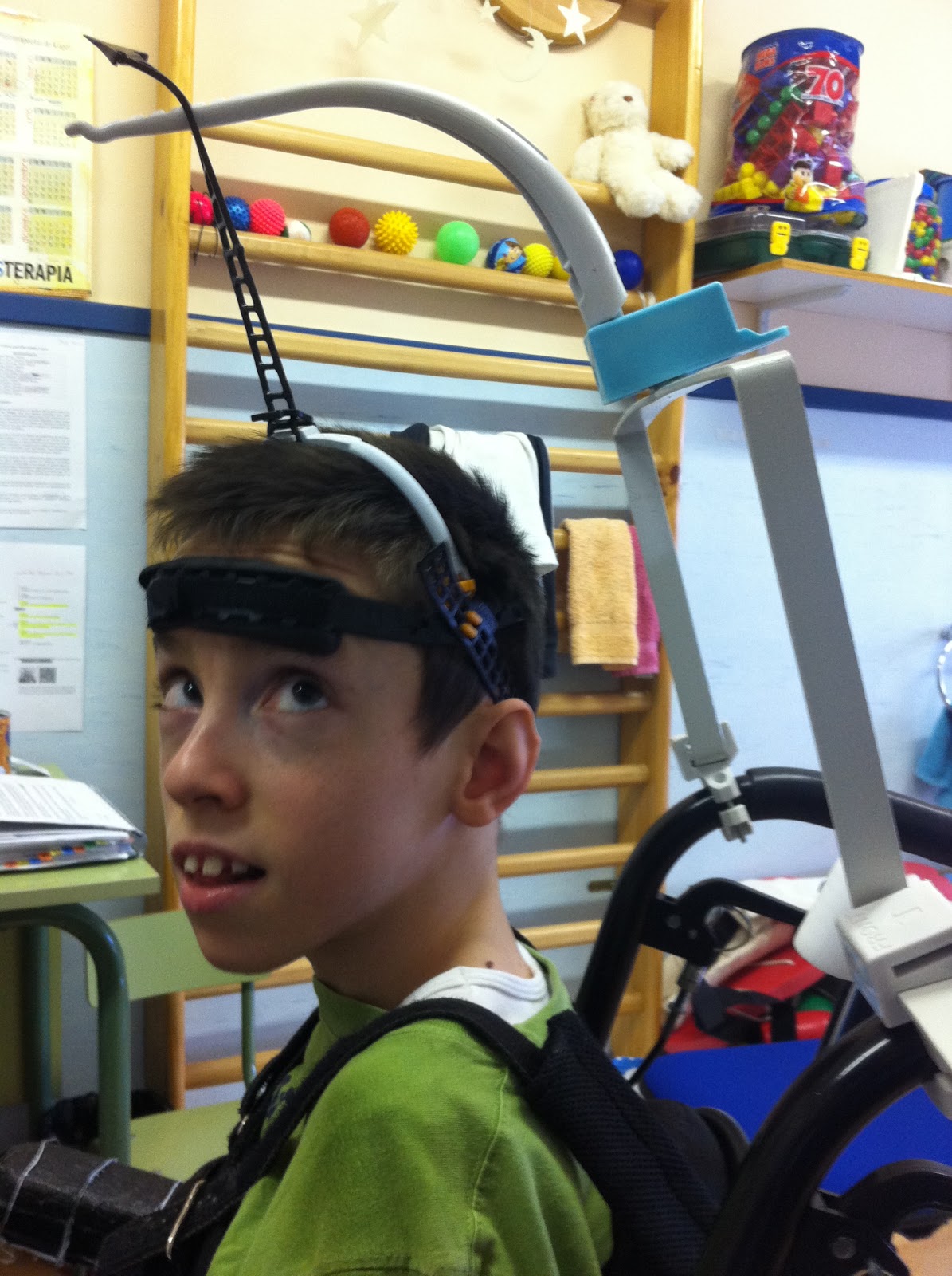 Pero, como no me quiero cabrear mas de lo que ya estoy, os voy a contar que la última adquisición casera que hemos hecho ha sido el Head Pod, un aparato que le ayuda a Daniel a mantener la cabeza en la posicion correcta y que además le ayuda a fortificar los músculos del cuello siendo una especie de paso hacia adelante para conseguir quitarle el cabezal de la silla cuando la consiga mantener erguida del todo. ¿El precio? ….300 euros, todo es a base de dinero y más dinero y ninguna ayuda, sigo pensando que es lamentable. Os pongo la foto que le hicieron en el cole con el Head Pod para que veais lo que se consigue con ésto, a mi me impresiona verle la cabeza de tan buena postura, al menos una alegría tenia que tener….