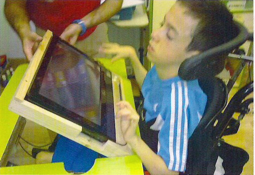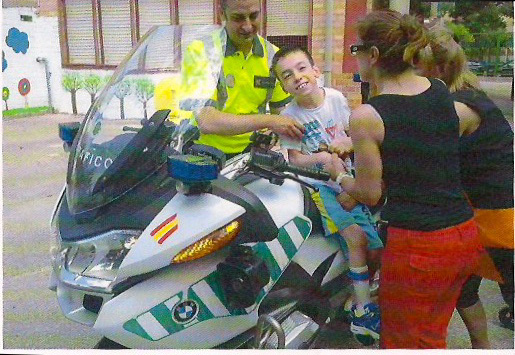 Estas dos fotos que os mostramos corresponden a los últimos días del curso escolar. Son dos momentos particularmente majos. A Daniel le gustan mucho las visitas de los policías municipales, que siempre le dejan subir a las motos, o a los coches, que ponen las sirenas… Por otro lado, ha servido de «modelo» para probar un prototipo «bricolajero» de mesa-soporte que están fabricando en el colegio para que los chicos con problemas de motricidad puedan trabajar con las pantallas táctiles.
