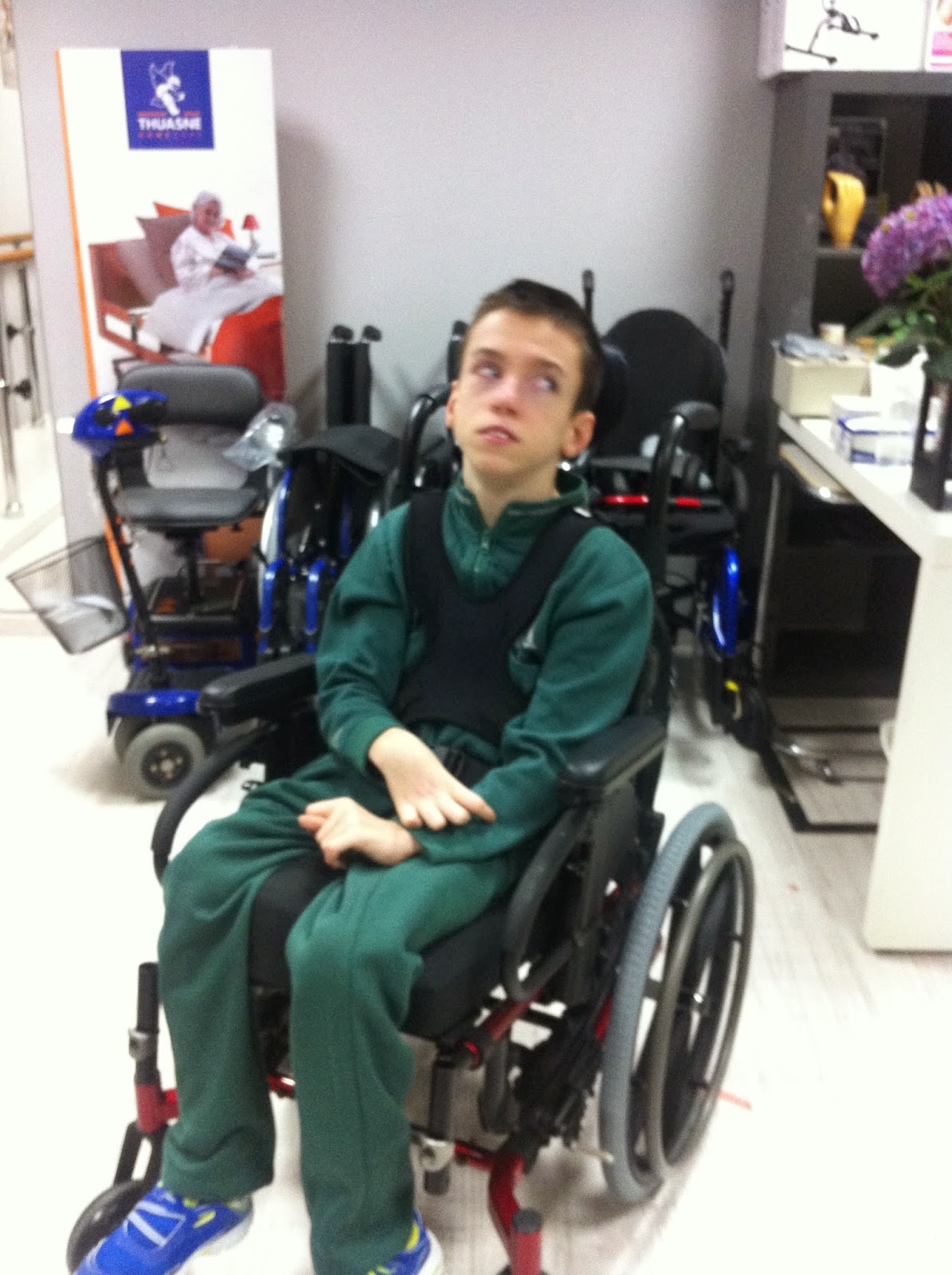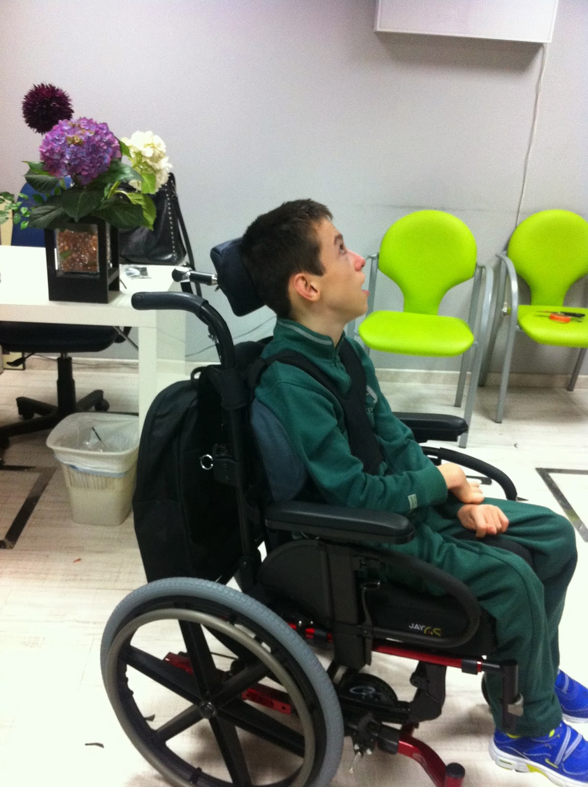 Os dejamos unas fotos de la sesión de ajuste de silla. En ellas faltan los reposapiés, que estaban en ese momento en el taller. Ah, una observación importante: el cabezal nuevo ha perdido sus alas laterales. Daniel ya no las necesita, porque su control cefálico ha avanzado bastante. Así puede mirar mucho más libremente alrededor (por eso su ademán de inspección ocular) y ampliar su control natural de observación propia.